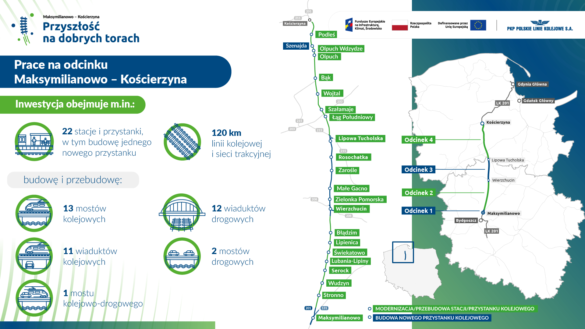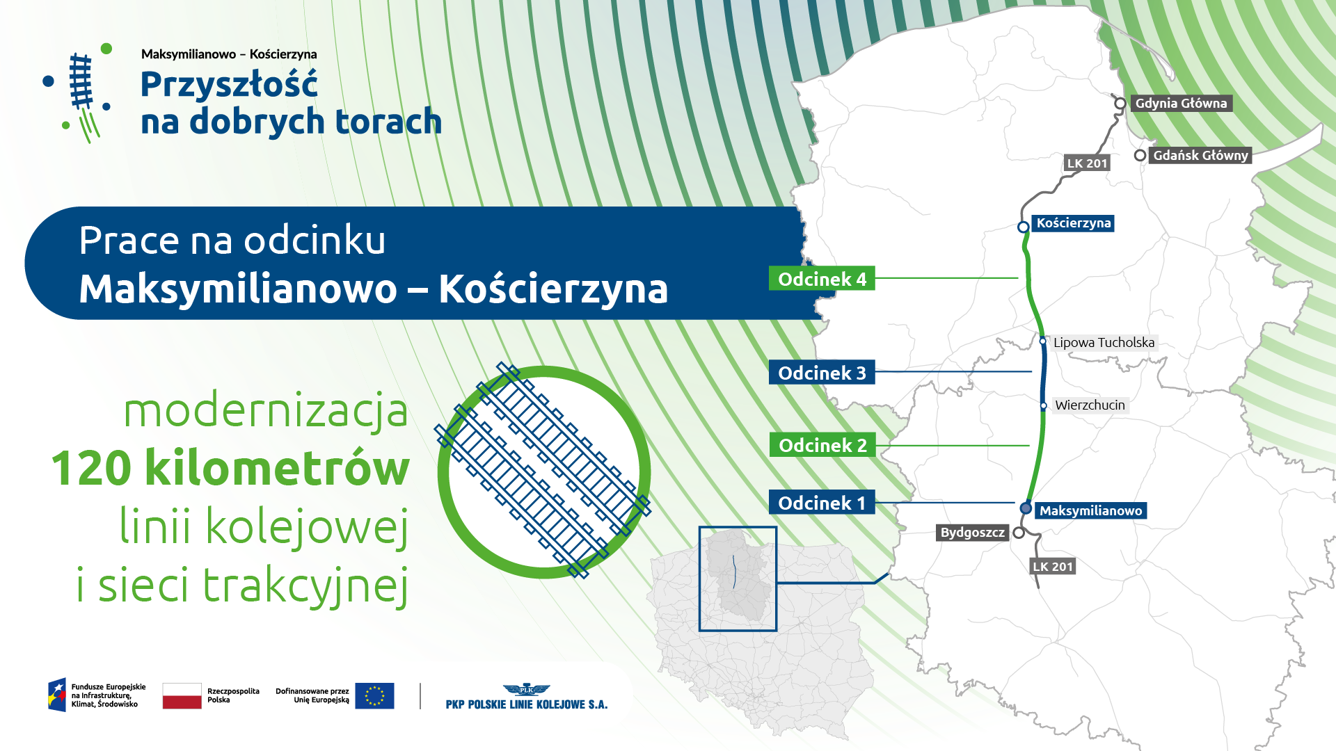 Ogłosiliśmy przetargi na modernizację odcinków Maksymilianowo – Wierzchucin, Wierzchucin – Lipowa Tucholska oraz Lipowa Tucholska – Kościerzyna. Zgodnie z harmonogramem, trasa z Maksymilianowa do Kościerzyny (podzielona na cztery kontrakty) zostanie zmodernizowana do 2029 roku, natomiast prace budowlane na odcinku Gdańsk Osowa – Gdynia Główna potrwają do końca 2031 roku. Zakończenie całego projektu zaplanowano na 2032 rok.